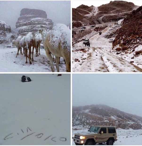 Mai mulţi locuitori ai Arabiei Saudite s-au adunat în regiunea Tabuk din nordul statului, unde altitudinea mare însemna un strat mai consistent de zăpadă .