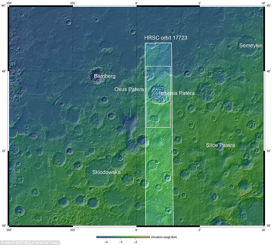 În ceea ce priveşte Ismenia Patera, care are o adâncime maximă de 1.750 de metri faţă de terenul înconjurător, depozitele sedimentare şi gheaţa au umplut spaţiul lăsat liber dând forma observată astăzi. Aceasta totuşi diferă de craterele de impact întâlnite în mod normal, precum marginile ridicate ale craterului, care nu se întâlnesc aici.