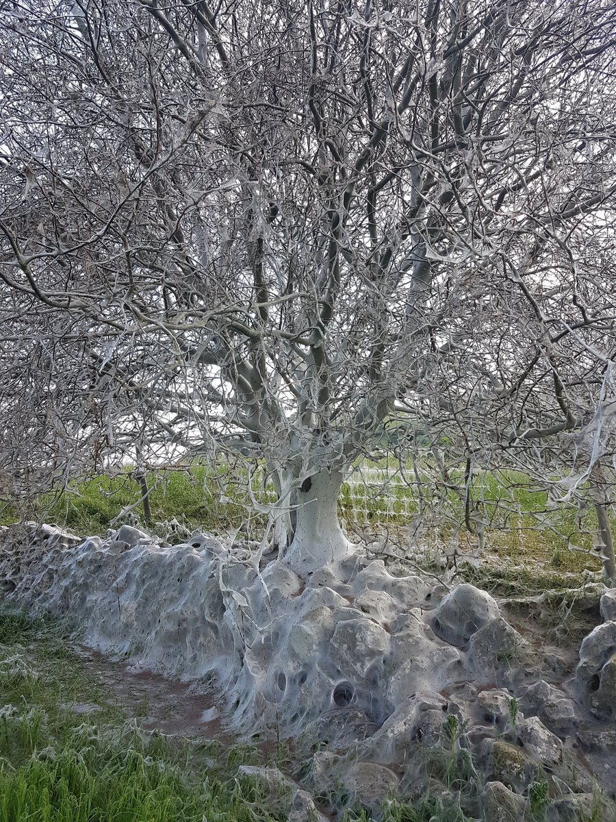 „În întregul arbore se mişcau larvele”, a adăugat el. Deşi par a fi pânze de păianjen, acestea erau de fapt cuiburi pentru moliile cireşelor sau moliile din specia Deilephila elpenor. Larvele moliilor sau omizile produc mătase, iar unele specii, precum molia cireşilor, produc cantităţi uriaşe de pânză.