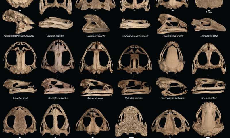 Un studiu efectuat pe cranii reprezentative de la toate cele 158 familii de broaşte care trăiesc astăzi a arătat că craniile unora dintre acestea prezintă forme neobişnuite. Acest fenoemn, cunoscut drept hiperosificare, apare într-o proporţie importantă la broaşte, notează Phys.