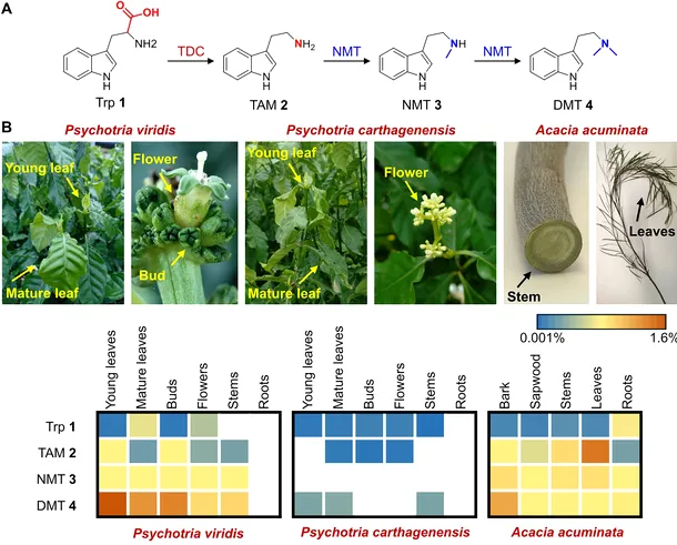 Ele au identificat genele esențiale din două plante, Psychotria viridis și Acacia acuminata, implicate în producerea de DMT și au cartografiat pașii chimici necesari. Apoi au combinat aceste informații cu gene provenite din ciuperci psihedelice (Psilocybe cubensis) și din broasca Rhinella marina (broasca de trestie de zahăr), adăugând și enzime auxiliare din orez și creson.
