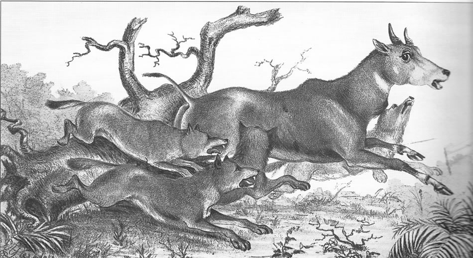 Desen de epocă care reprezintă o haită de doli care atacă o antilopă nilgau