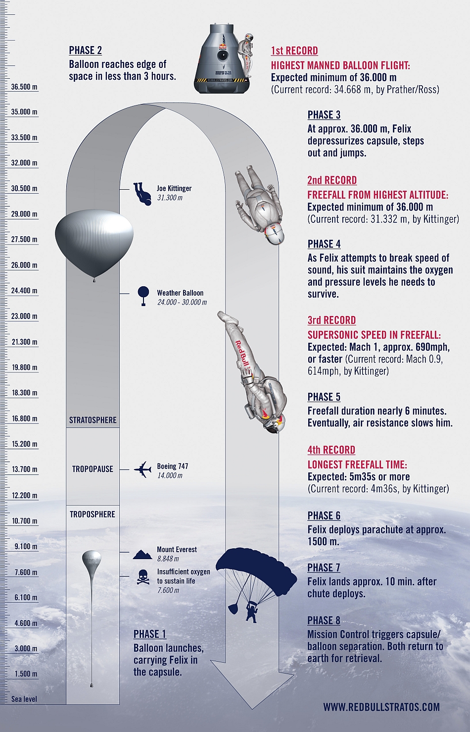 Planul este simplu: Baumgartner urmează să urce într-o capsulă presurizată, ataşată de cel mai mare balon cu heliu conceput vreodată, până la uluitoarea altitudine de 37 de kilometri. Odată ajuns acolo, Felix va părăsi capsula echipat într-un costum presurizat pentru a zbura spre Terra.