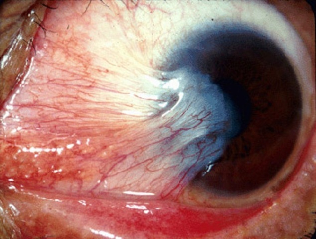 Dacă pata sidefie se întinde spre cornee, având o formă oarecum triunghiulară, atunci poate fi vorba  despre pterigyium (foto) – afecţiune numită popular „ochiul surferului”, deoarece apare mai des la persoane care sunt expuse intens la ultraviolete, precum sportivii menţionaţi. Pterigyium-ul poate afecta vederea; la nevoie,  poate fi tratat chirugical, sub anestezie locală.