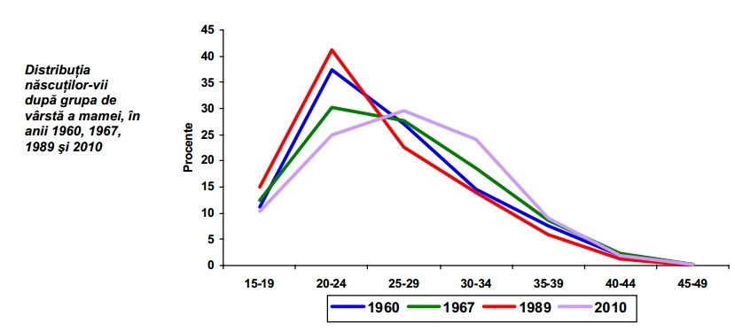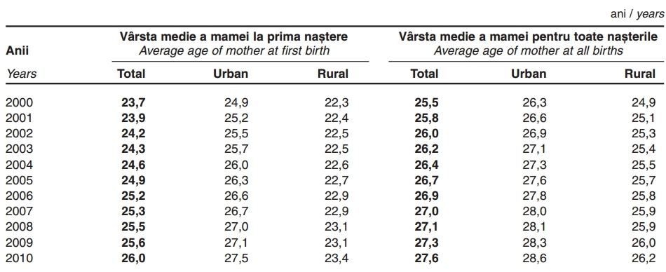 În 1980, vârsta medie a mamei la prima naştere era de 22,6 ani, urcând în 2010 la 26 de ani. În mediul urban, vârsta medie la care româncele au primul copil este şi mai înaintată: 27,5 ani.