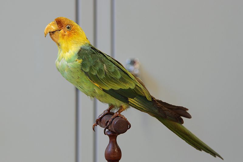 -Papagalul Carolina Parakeet sau Carolina Conure: a fost singurul papagal originar din estul Statelor Unite, foarte căutat pentru penele lui frumoase, de culoare verde, folosite deseori pentru împodobirea pălăriilor. Ultimul exemplar a murit în captivitate în 1918.