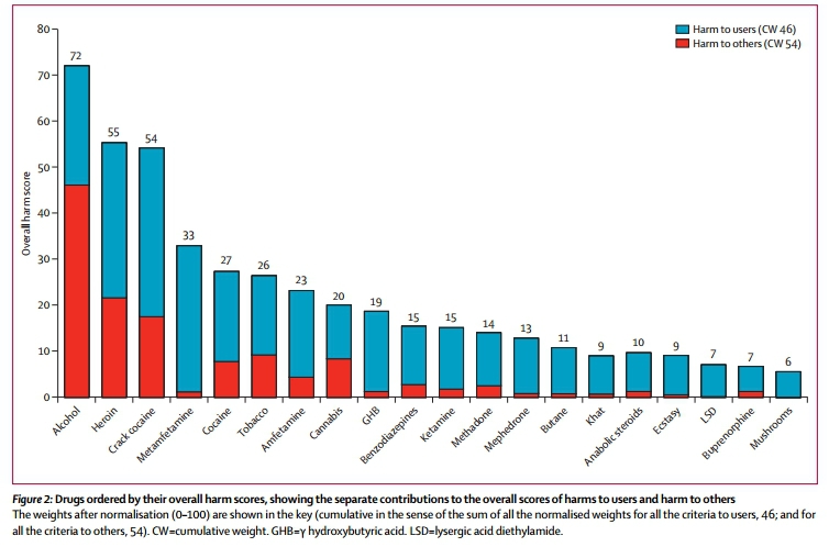 În 2010, un comitet ştiinţific independent din Marea Britanie a analizat 20 de droguri pentru a evalua daunele pe care le provoacă atât indivizilor care le folosesc, cât şi societăţii (prin criminalitate, distrugerea familiilor, absenteism la locul de muncă şi alte probleme). Cumulând datele, cercetătorii au concluzionat că alcoolul este drogul cel mai periculos, urmat de heroină şi de cocaina de tip crack. Marijuana s-a clasat pe locul al 8-lea, prezentând un sfert din pericolul reprezentat de alcool.