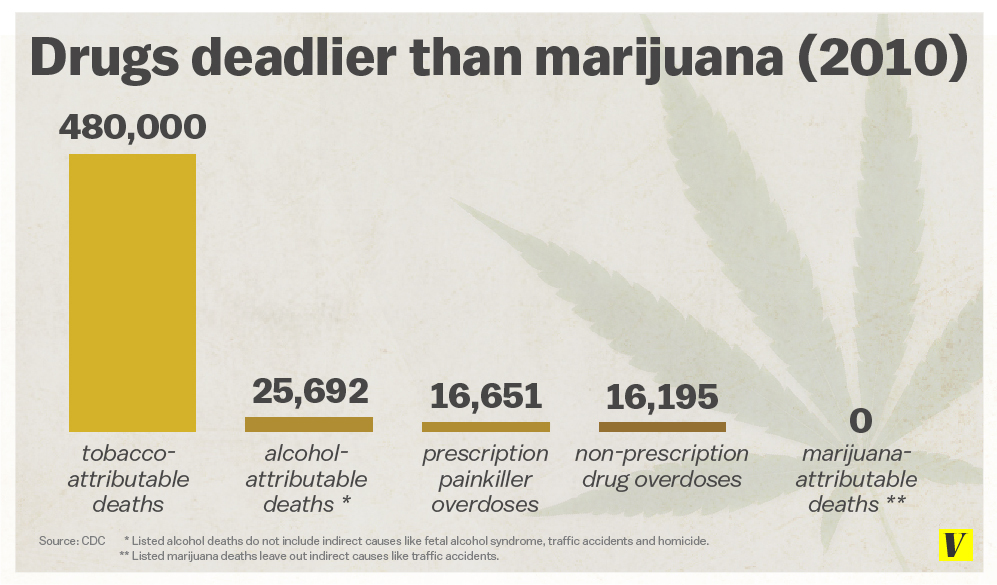 Spre comparaţie cu alte droguri legale, cum ar fi alcoolul sau tutunul, marijuana este mai puţin periculoasă. Dacă tutunul provoacă cancer, iar consumul excesiv de alcool poate duce la ciroză, în cazul marijuanei nu există o relaţie de cauzalitate între consum şi o boală letală. Cercetările arată însă că ea prezintă anumite riscuri pentru sănătate în rândul persoanelor vârstnice sau care au probleme cu inima..