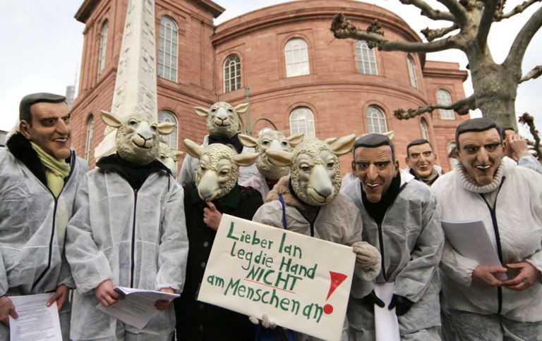 Protest apărut în urma anunţului clonării oii Dolly. Manifestanţii poartă o pancartă cu mesajul „Dragă Ian, nu te atinge de oameni”, adresat cercetătorului Ian Wilmut, unul dintre oamenii de ştiinţă care au lucrat la proiectul clonării oii Dolly. Foto: Martin Oeser/Mediafax Foto/AFP