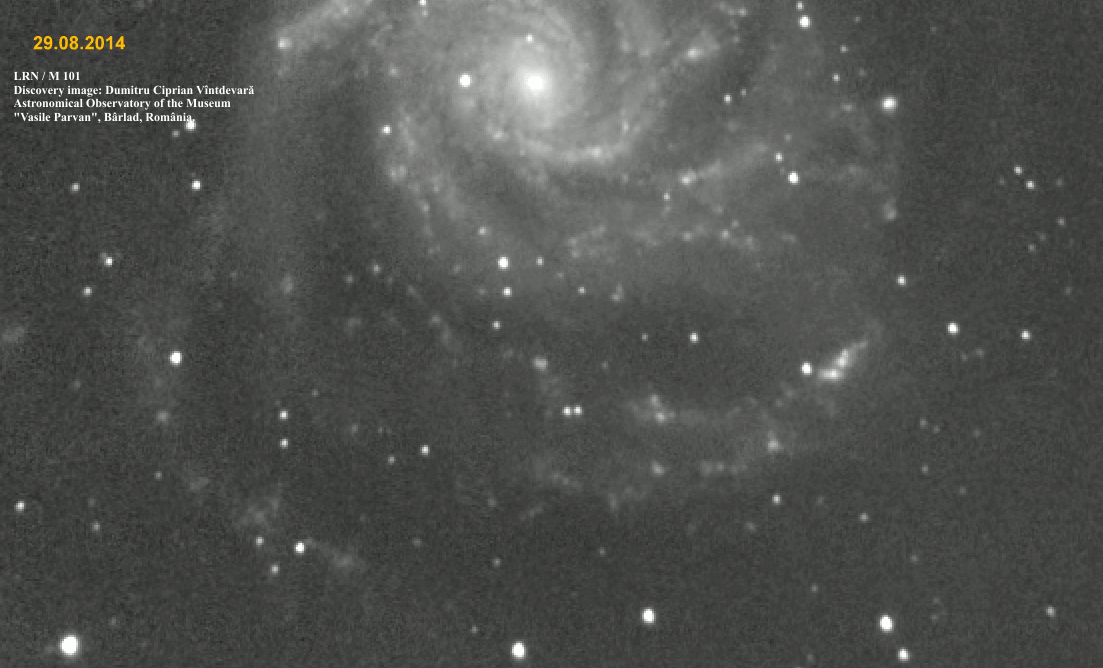 Specialiştii Observatorului Astronomic „Perseus” din cadrul Muzeului Bârlad au descoperit, cu ajutorul telescopului principal, o novă roşie luminoasă, un astru ceresc situat în Galaxia Messier 101, aflată la aproximativ 21 de milioane de ani-lumină de Pământ, transmite corespondentul MEDIAFAX.