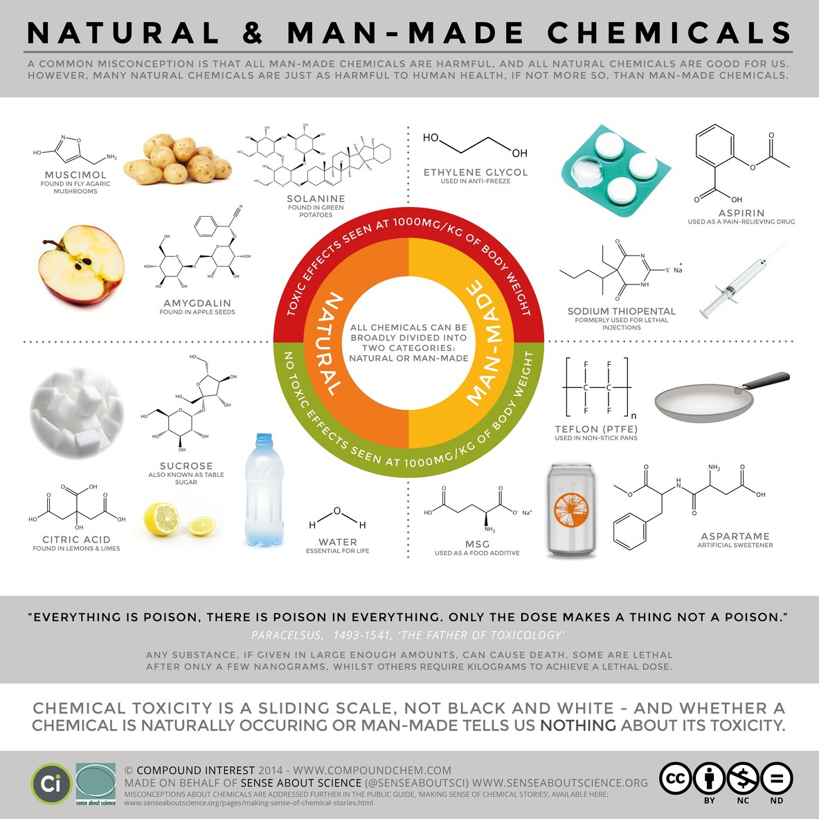 Ceea ce le face să fie periculoase este cantitatea în care sunt consumate. Într-adevăr, există numeroase substanţe create de om care au fost interzise din cauza unor riscuri de sănătate, însă, în medie, acestea au făcut mai mult bine decât rău. Chiar şi substanţe care sunt considerate foarte poluante, cum ar fi pesticidele DDT, sunt folositoare. Organizaţia Mondială a Sănătăţii susţine folosirea acestora pentru a controla răspândirea unor boli precum malaria.