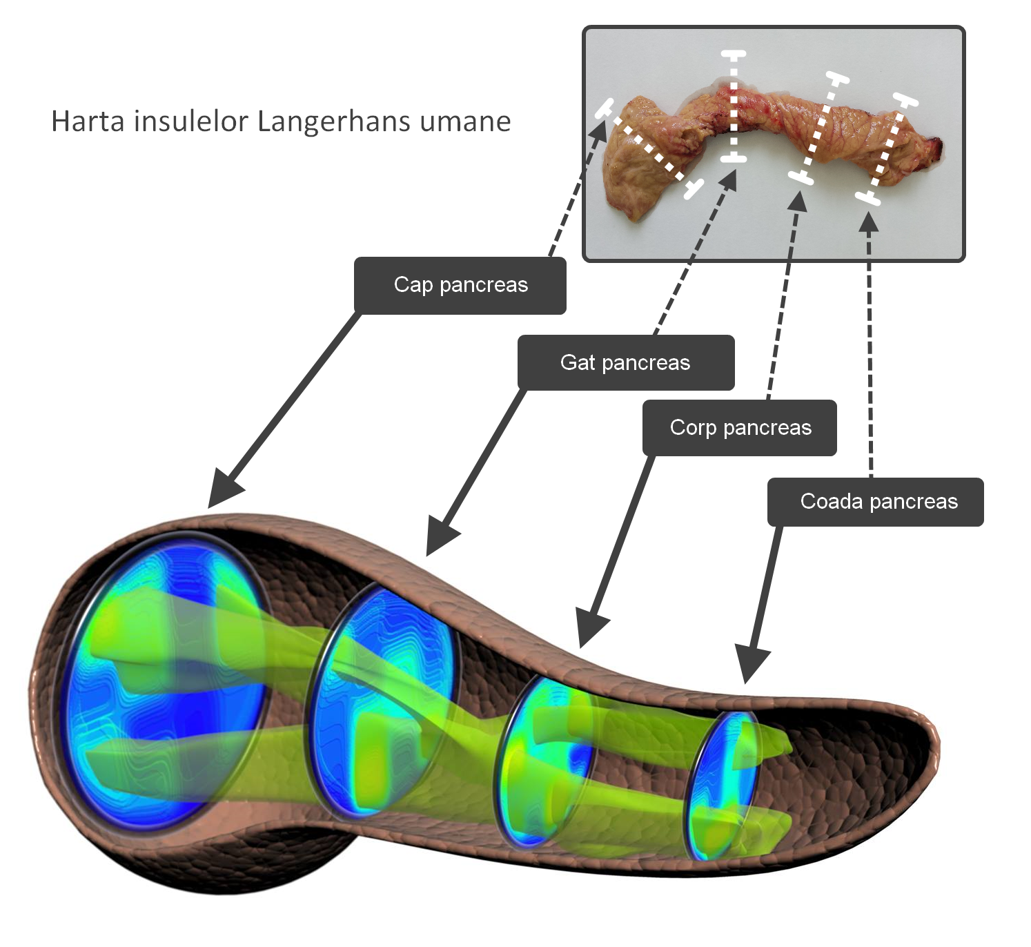 Este interesant de menţionat faptul că până la publicarea acestor rezultate nu exista un sistem de referintă pentru pancreasul uman. Aproape toate studiile efectuate de-a lungul timpului fiind efectuate pe porţiuni mici de ţesut pancreatic. Oamenii de ştiinţă români au aflat caracteristicile insulelor Langerhans şi distribuţia lor spaţială prin studiul unui pancreas sănătos luat de la un donator. Astfel, aceştia au analizat timp de jumatate de an 4 secţiuni transversale prin pancreas şi anume: capul, gâtul, corpul şi coada pancreasului (vezi figura 2). Astfel aflăm, spre exemplu, că diametrul mediu al insulelor Langerhans umane este de 108.92 µm sau că numărul lor mediu în interiorul pancreasului uman este de aproximativ 3,2 milioane. Studiul lor ne spune, de asemenea, faptul că volumul total al insulelor este de aproximativ 2 cm3, care reprezintă 4.5 % din volumul total al pancreasului. Un alt calcul riguros arată faptul că celulele beta (producatoare de insulină) reprezintă 2.6% din volumul total al pancreasului (cu un volum de 1.15cm3).