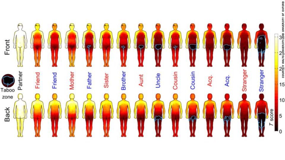Cercetătorii de la Universitatea Aalto din Finlanda şi cei de la Universitatea Oxford, din Marea Britanie, au efectuat un studiu pe un eşantion de 1.368 de persoane. Participanţilor li s-au oferit imagini ale siluetelor din faţă şi din spatele coprului uman, însoţite de cuvinte precum membri ai reţelelor sociale, membri de familie, prieteni, cunoscuţi şi străini. Aceştia au fost rugaţi să coloreze regiunile corpului în funcţie de gradul de atingere pe care îl acceptă de la persoanele de mai sus.
