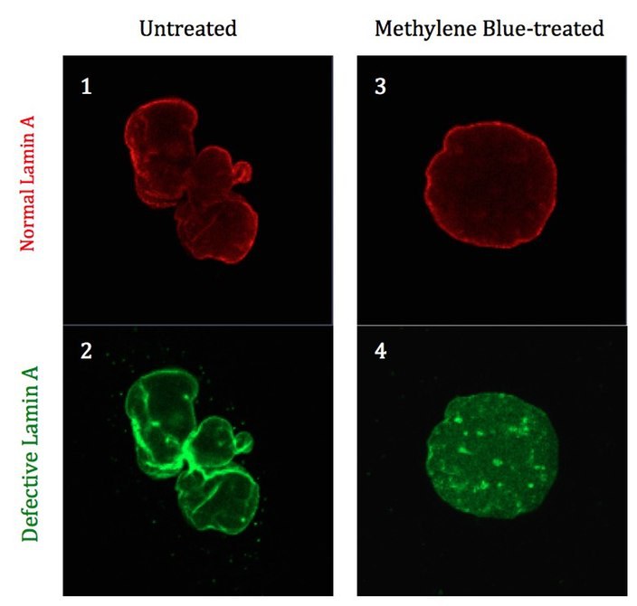 Lucrând cu celule fibroblaste umane, echipa a descoperit că albastru de metilen a modificat celulele afectate de progerie, oferindu-le formele iniţiale, normale, rotunde într-o săptămână şi a reuşit să repare aproape complet în 8 săptămâni, astfel încât celulele afectate erau aproape imposibil de distins de celulele normale.