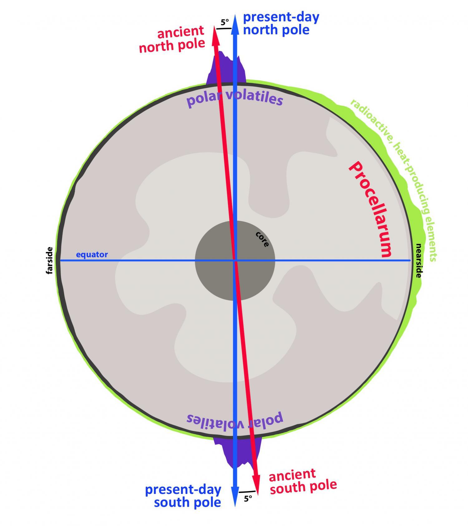Cercetătorii americani susţin că schimbarea axei satelitului natural al Pământului s-ar fi produs ca urmare a activităţii vulcanice intense, care a dus la topirea unor porţiuni din mantaua Lunii, în urmă cu circa 3 miliarde de ani. ,,La suprafaţa acestui obiect cosmic a fost identificat un înveliş, denumit Procellarum, în care s-au putut găsi elemente formate în primele faze de existenţă ale corpului ceresc. În urmă cu foarte mult timp, acest strat a acţionat asemenea unui cuptor, care a încălzit mantaua aflată dedesubtul lui”, a adăugat Matthew Siegler.