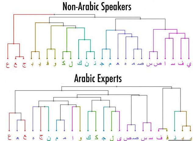 Cercetătorii au analizat aceste rezultate folosind gruparea ierarhică, sortând literele care păreau similare pentru începători şi experţi.