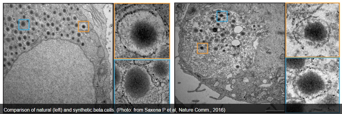 Aceste celule beta nu numai că arată foarte similar cu omologii lor naturali, dar şi conţin pete întunecate cunoscute sub numele de granule, care stochează insulina.