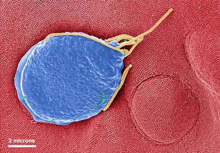 O bacterie Giardia (albstru şi galben) ataşată de o singură celulă intestinală (roşu).
