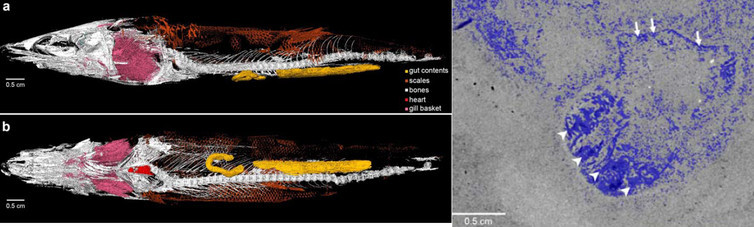 Imagistica peştelui Rhacolepis prin tomografie sincrotronă. Imaginea arătă inima (în stânga) şi o secţiune transversală prin valvele inimii (cele cu săgeată).