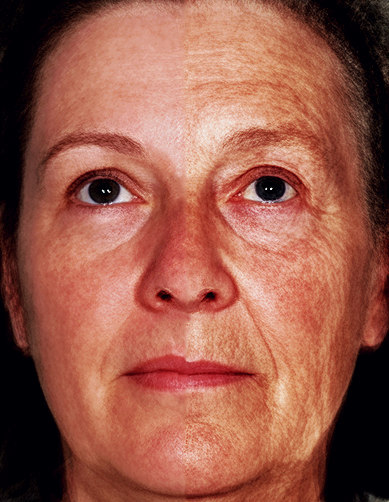 Foto: © Unilever / Impactul îmbătrânirii asupra trăsăturilor feţei asa cum este ilustrat de chipul a 12 femei cu vârsta de 47 ani (partea dreaptă a feţei) şi a 12 femei cu vârsta de 70 ani ( partea stângă). Îmbătrânirea afectează pielea prin apariţia ridurilor, a pigmentării neuniforme şi afectează trăsăturile faciale prin dimensiunea buzelor şi apariţia pliurilor din jurul buzelor. Astfel, unii oameni par mai tineri decât sunt de fapt, iar alţii mai bătrâni.
