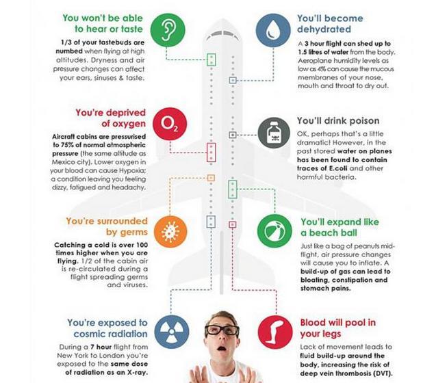 Conform unui infografic realizat de Compare Travel Insurence zborul cu avionul poate declansa numeroase dezechilibre în corpul nostru sau chiar modificări celulare, notează The Independent.