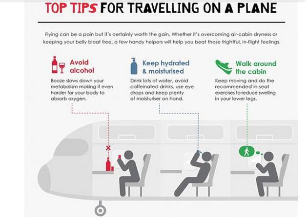 Aceştia ne îndeamnă să evităm alcoolul, să consumăm multă apă pentru a ne menţine hidrataţi. De asemenea, pentru a evita problemele de ciculaţie trebuie să încercăm să mişcăm cât mai des picioarele în timpul zborului, iar