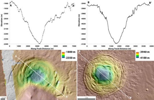 Analizele au dezvăluit că depresiunile aveau forma unui coş de vulcan cu o circumferinţă mare, care se îngusta în adâncime.