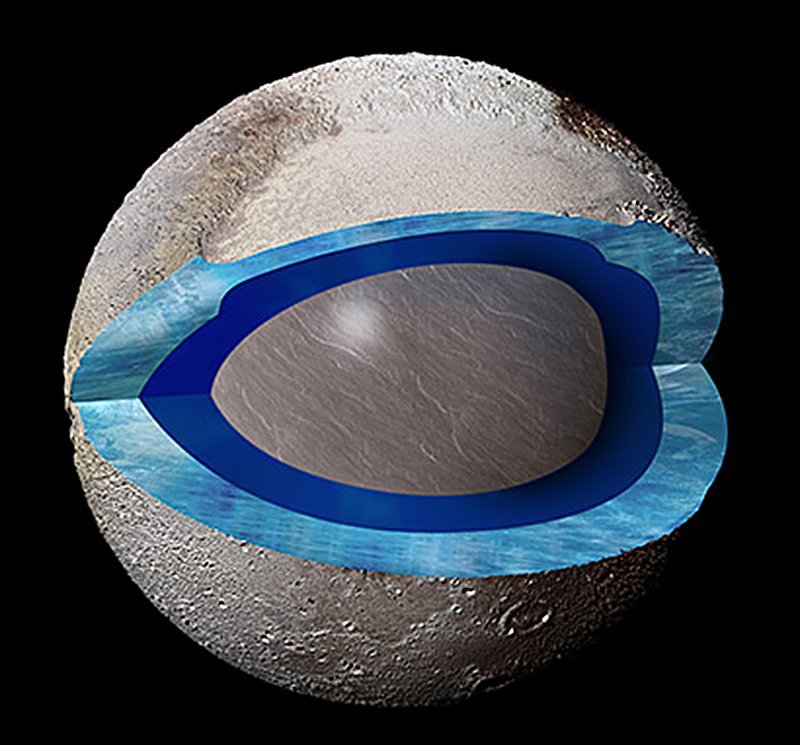 Din primele imagini de pe New Horizons s-a observat un bazin de nitrogen îngheţat, de o întindere de 841 de kilometri pătraţi. De atunci s-a observat că toată planeta este acoperită de un ocean foarte adânc, cantitatea fiind estimată la 75% din totalul apei lichide a Terrei, conform datelor oferite de Business Insider.