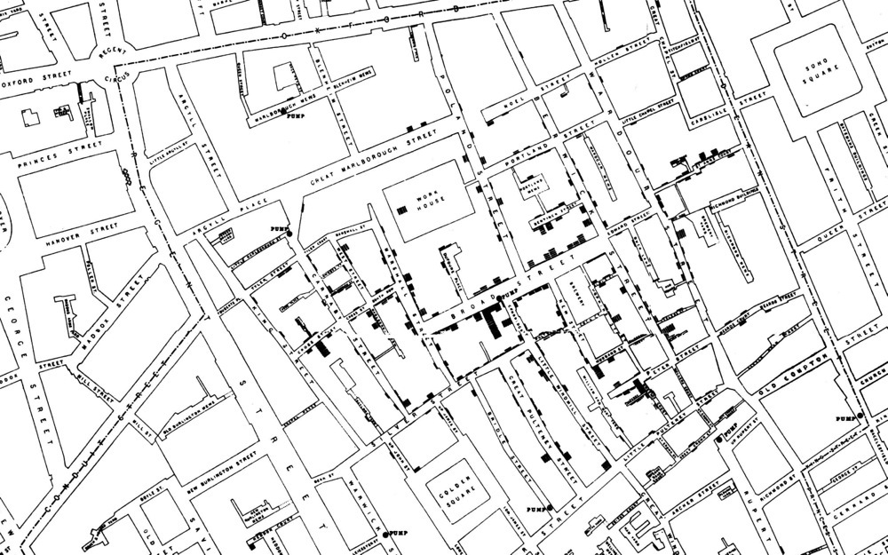 Când a apărut holera în Londra, în 1854, fizicianul John Snow a luptat împotriva opiniei populare care considera că holera este provocată de ,,aerul rău”. Acesta a încercat să puncteze zonele din Londra în care se aflau cazurile de holeră. Harta lui a dovedit că aerul nu a fost cauza, ci apa dintr-o pompa de pe stradă. Snow este responsabil pentru salvarea a milioane de vieţi.