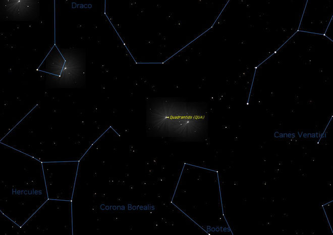 QUADRANTIDE. Este unul din cei mai puternici curenţi de meteori, producând, în timpul maximului între 100 şi 140 de meteori pe oră, la o viteză de 41 de kilometri /secundă. Meteorii acestui curent sunt slabi ca strălucire, fiind nevoie de un cer curat, fără lumini, pentru a îi putea observa.