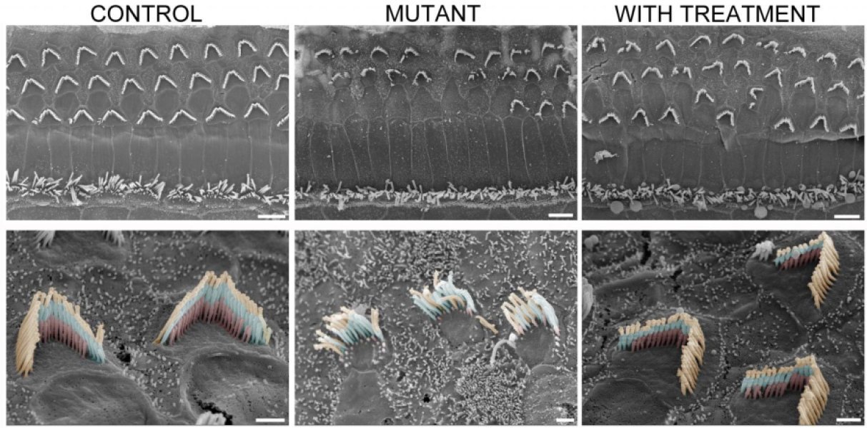 În stânga sunt reprezentaţi senzorii în V ai şoarecilor sănătoşi, în mijloc sunt senzorii urechii unui şoarece cu probleme de auz, iar în dreapta sunt senzorii celui din mijloc în urma tratamentului. Se observă o restaurare aproape completă a acestor senzori.