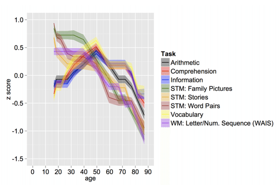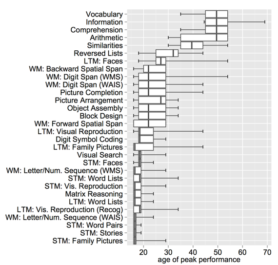 Aceste rezultate au arătat că, deşi majoritatea abilităţilor cognitive îşi ating maximul undeva aproape de 30 de ani, precum memoria şi recunoaşterea tiparelor, există câteva exemple notabile care se îmbunătăţesc odată cu timpul, atingându-şi capacitatea maximă în anii 50. Acestea includ vocabularul, matematica, cultura generală şi înţelegerea şi explicarea diferitelor concepte. Aceste aptitudini au la bază acumularea cunoştinţelor şi a experienţei.