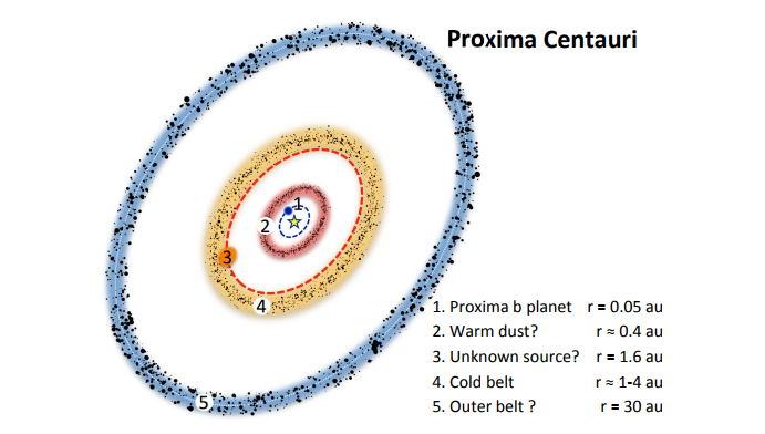 De asemenea, conform echipei de cercetători, datele sugerează că ar mai fi încă o centură, chiar mai rece, şi la o distanţă de zece ori mai mare de steaua sa. Mai mult decât atât, cercetătorii au descoperit alte lucruri interesante cu privire la Proxima Centauri, dar este prea devreme pentru a preciza cu exactitate. Cel mai interesant indiciu este cu privire la „ceva” găsit la 1,6 unităţi astronomice faţă de stea (imaginea de mai jos).