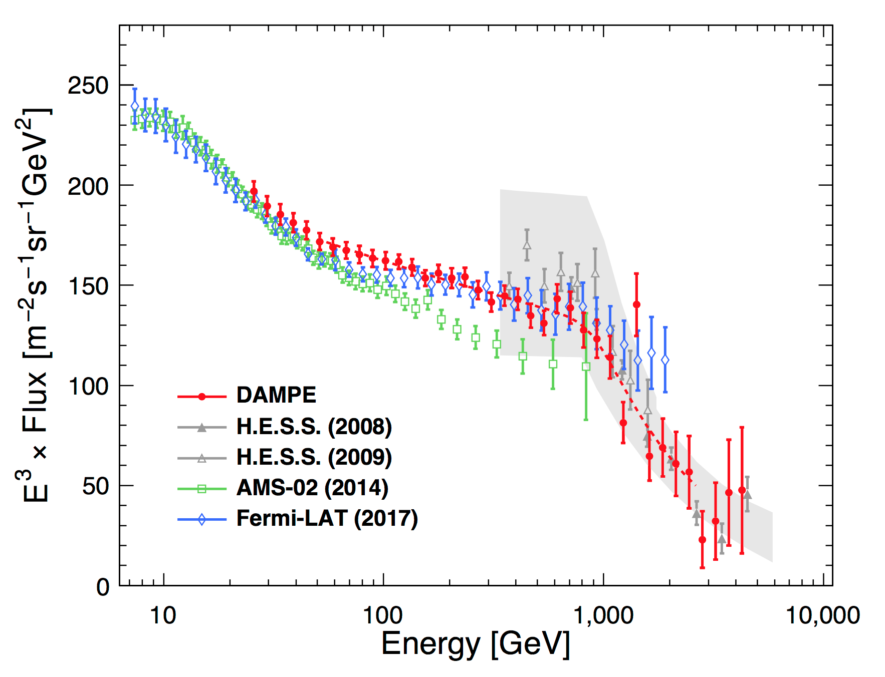 Dacă se întocmeşte un grafic (imaginea de mai sus) cu numărul de electroni care loveşte satelitul raportat la energia lor, cantitatea descreşte pe măsură ce energia creşte. Dar începând din jurul valorii de 0,9 tera-electronvolţi (TeV) ai electronilor, valoare care este de două milioane de ori mai mare decât energia electronilor obişnuiţi, DAMPE a observat o scădere bruscă misterioasă. Schimbarea poate fi rezultatul unui pulsar în apropiere sau chiar a materiei întunecate.