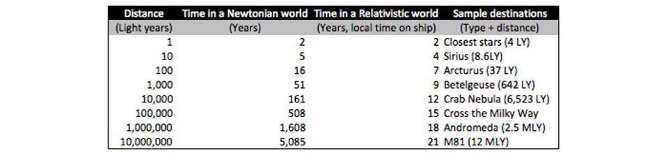 Se observă că dacă dorim să mergem mai mult de 50 de ani lumină, vom avea avantajul teoriei relativităţii, iar dincolo de 1.000 de ani lumină putem ajunge acolo în timpul unei vieţi umane numai datorită relativităţii.