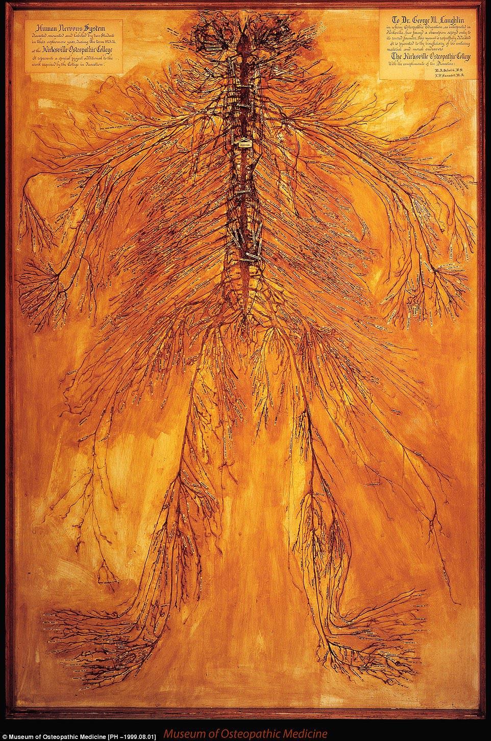 Rezultatul a fost expus în cadrul Museum of Osteopathic Medicine din Kirksville, Missouri, locul în care a fost disecat cadavrul. Conform Mail Online, identitatea persoanei al cărui sistem nervos a devenit exponat nu este cunoscută. Directorul muzeului, Jason Haxton, susţine că persoana probabil provenea dintr-o familie săracă sau dintr-o închisoare.