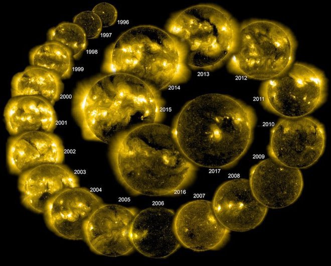 Cercetătorii din cadrul SOHO au realizat o schemă compusă din 22 de imagini cu Soarele, realizate în fiecare primăvară de-a lungul unui singur ciclu solar complet. Atunci când Soarele se află în cel mai activ punct, câmpul magnetic puternic este observat sub forma petelor strălucitoare de pe atmosfera exterioară a stelei, denumită şi coroană solară. Petele negre apar sub forma unei reduceri a câmpului magnetic solar.
