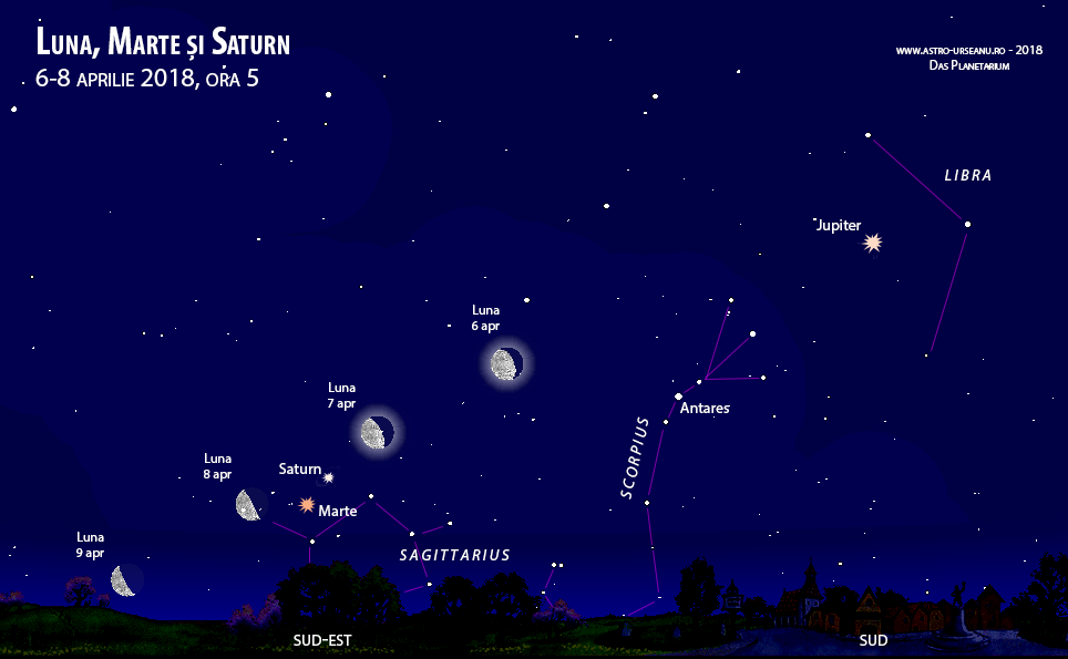 Marte, mic şi portocaliu, iar Saturn, mare, gălbui şi înconjurat de un inel se vor putea vedea prin acelaşi telescop, la o constelaţie distanţă. Luna în descreştere va fi acompaniată de Saturn şi Marte pe cerul dimineţilor timpurii de 7 şi 8 aprilie.