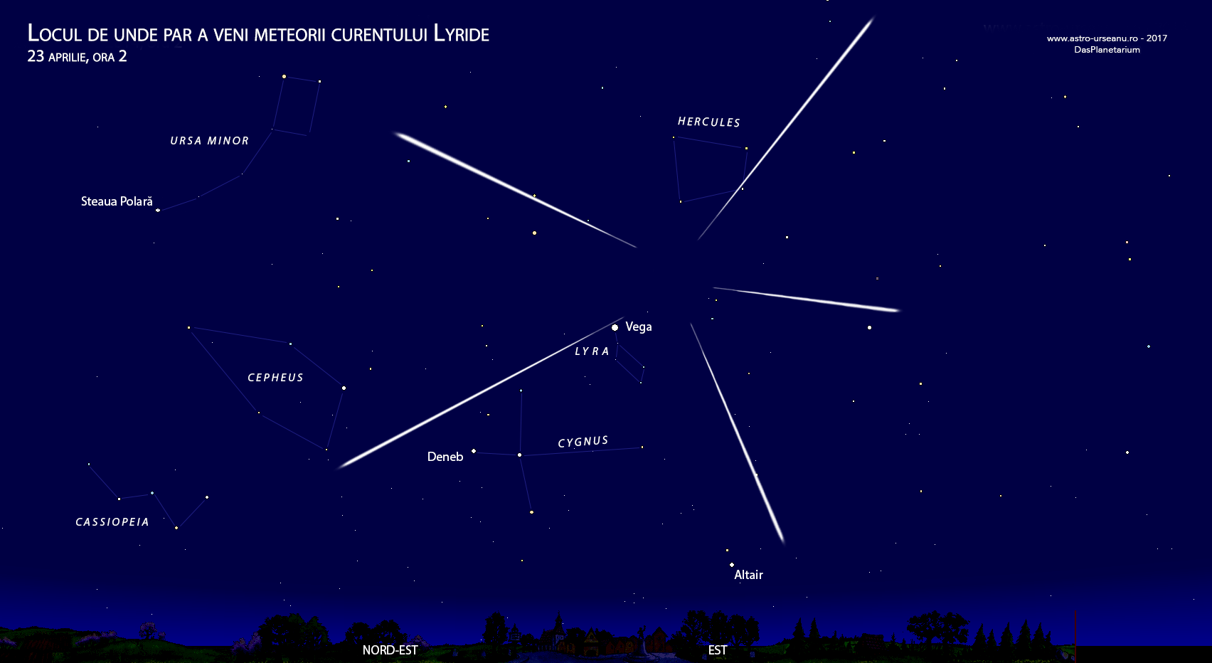 Evenimentul astronomic îşi va atinge maximul în noaptea de 22 – 23 aprilie. Sub cerul liber, departe de luminile oraşului, observatorii se pot aştepta la 15-20 de stele căzătoare pe oră. Corpurile vor radia din constelaţia Lyra de pe partea estică şi nord-estică a cerului, scrie National Geographic.