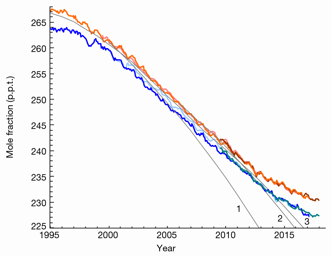 În diagrama de mai jos, se poate vedea concentraţia de CFC-11 în Emisfera Nordică (linia roşie) şi Emisfera Sudică (linia albastră) în comparaţie cu declinul prezis (liniile gri):
