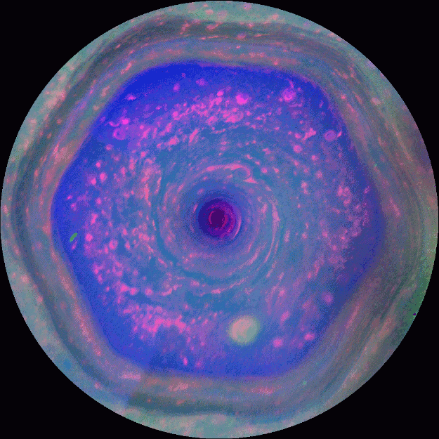 Anterior observaţiilor lui Cassini, sonda Voyager a prezentat în 1980 existenţa hexagoanelor de la altitudine joasă din regiunea polului nord al planetei. Hexagonul este considerat un curent de lungă durată asociat rotaţiei lui Saturn, similar cu modul în care rotaţia Pământului influenţează curenţii polari.