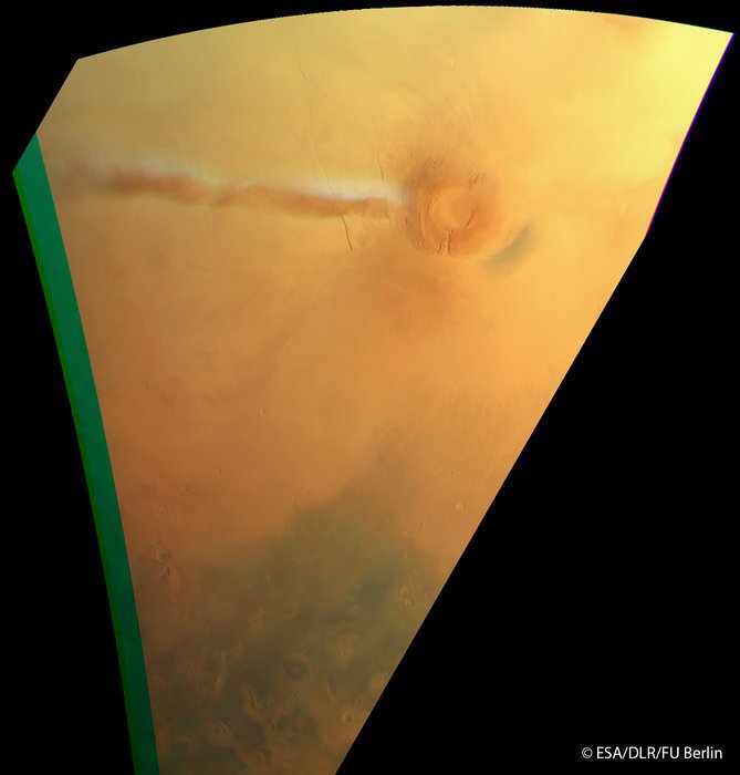 Zona cu vapori se întinde pe 1.500 de kilometri de-a lungul vulcanului Arsia Mons şi apare într-o imagine realizată de sonda Mars Express pe 13 septembrie. Conform Science Alert, din acel moment norul se află în acelaşi loc şi în timpul dimineţilor marţiene acesta creşte, fiind vizibil şi de telescoapele de pe Pământ.