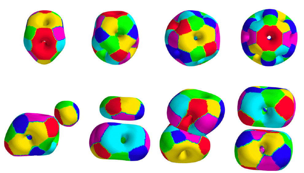 Savanţii prezic că unii nuclei de atomi ar putea avea mai multe forme. Înainte, structura acestora, atunci când era calculată cu metoda skyrmionului, nu era în acord cu predicţiile (rândul de sus din imaginea de jos). Dar cu ajutorul noilor calcule, s-a aflat că nucleii conţin mai multe grămezi, aşa cum era de aşteptat (rândul de jos). Culorile indică tipul de pion care domină fiecare regiune.