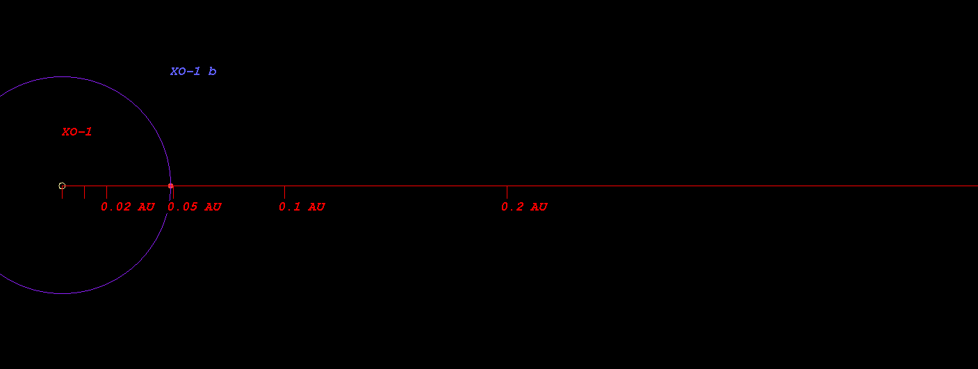 Proiecţia orbitei planetei XO-1 b în jurul stelei XO-1. În acest sistem planetar, planeta extrasolară XO-1 b orbitează în jurul stelei XO-1 o dată la fiecare 3,9 zile la distanţa sa orbitală de 0,05 AU (7300376,1 km). / Credit foto: EXOKyoto