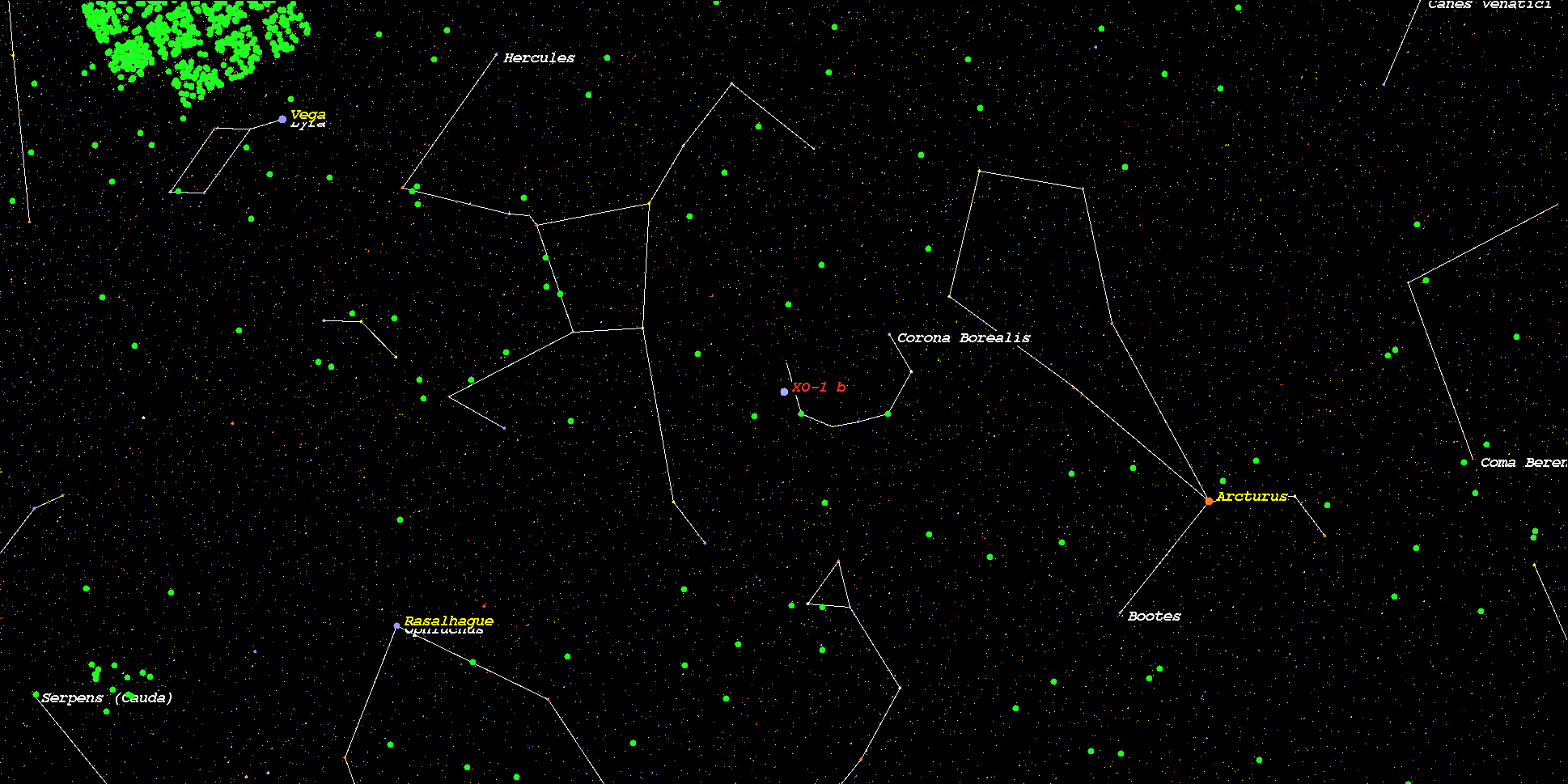 Harta constelaţiilor din vecinătatea stelei XO-1. Locaţia stelei în constelaţia Coroana Boreală este marcată în mod clar. / Credit foto: EXOKyoto