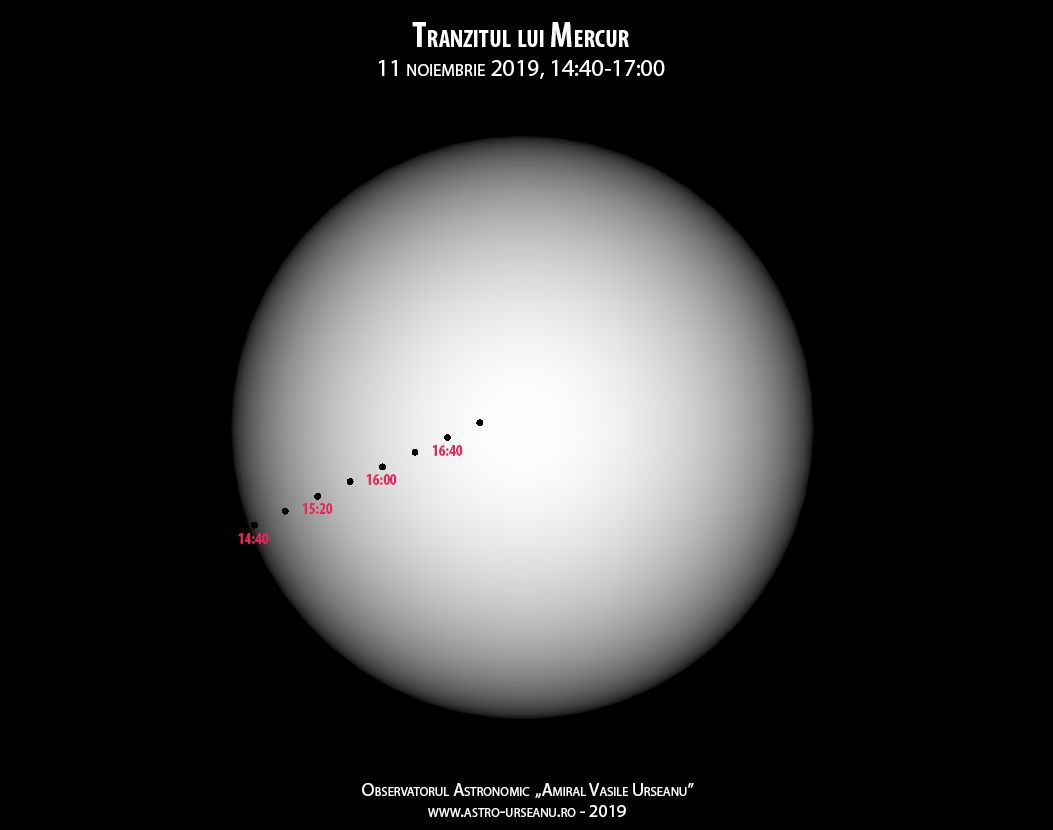 Potrivit specialiştilor de la Observatorul Astronomic „Amiral Vasile Urseanu” din Capitală, în România, tranzitul începe în jurul orei 14:35, în momentul în care Soarele se află la aproximativ 20 de grade deasupra orizontului (în sud-est mai sus cu câteva grade, iar în nord-vest mai jos). Din acel moment se poate vedea pe Soare un disc de circa 192 de ori mai mic decât discul stelei din centrul Sistemului nostru Solar. Discul întunecat al lui Mercur se va mişca din stânga sus spre mijlocul discului Soarelui.