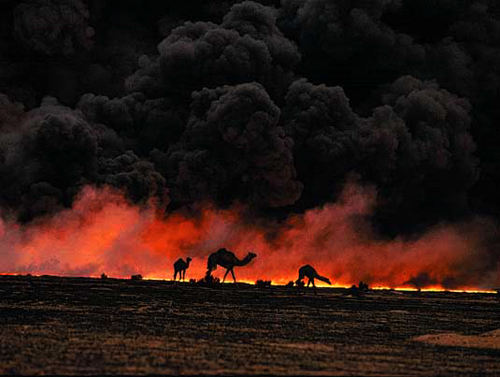 Imagini de cosmar – in urma retragerii trupelor irakiene, 6 milioane de barile de petrol au ars zilnic, vreme de 9 luni, in Kuwait, in 1991 – intunecand cerul