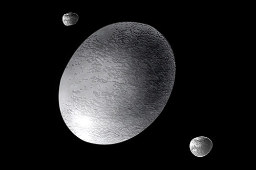 Dar forma asemenatoare cu cea a unei mingi de rugby pe care o are aceasta planeta si viteza rotirii ei nu sunt singurele bizarerii constatate. Humea are in vecinatatea sa si un satelit foarte neobisnuit.
