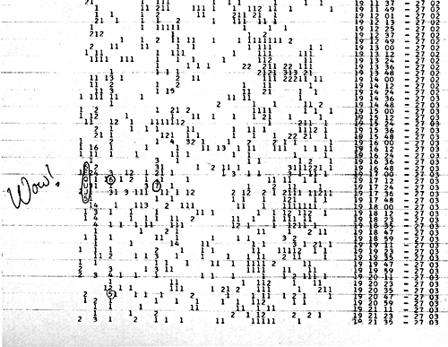 1977: un astronom care lucra in cadrul SETI a receptionat, cu ajutorul radiotelescopului de la Universitatea Ohio, SUA, un semnal radio neobisnuit. Surescitat la culme – va dati seama, era convins ca i-a auzit pe extraterestri! – a scris Wow! pe marginea foii de hartie pe care inregistrase evenimentul.