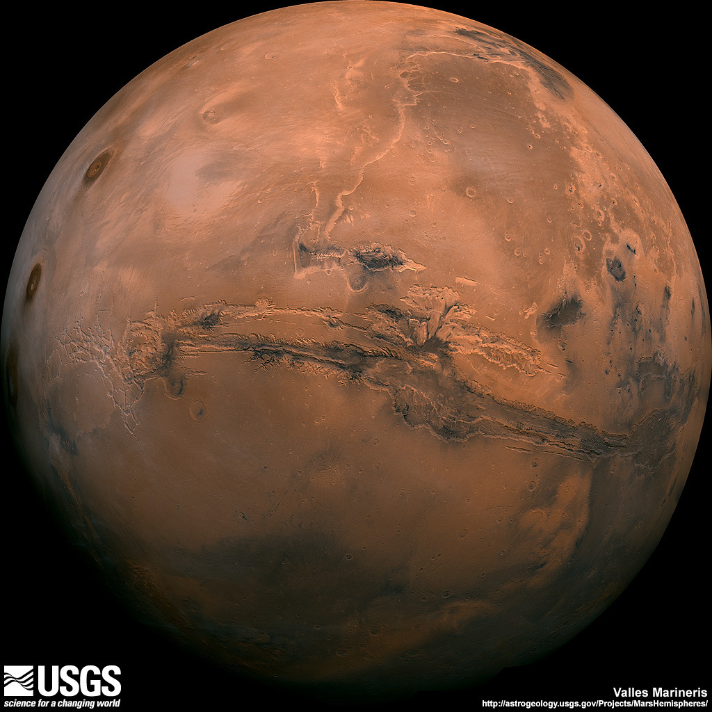Craterul martian despica patru milioane de metri de teren „rosu”, atingand adancimi maxime de pana la zece mii de metri. In comparatie, Marele Canion al fluviului Colorado, din SUA, are o lungime de „numai” 446 de kilometri si o adancime absoluta de aproximativ o mila, sau 1,6 kilometri. Se presupune ca Valles Marineris este o vale formata prin alunecarea si ascensiunea terenului, atunci cand roca topita din mantaua lui Marte s-a extins si a fortat limitele scoartei planetare.